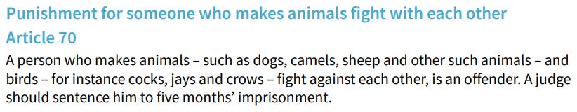 Break your wife’s bones, fifteen days in prison. Force dogs to fight, five months.