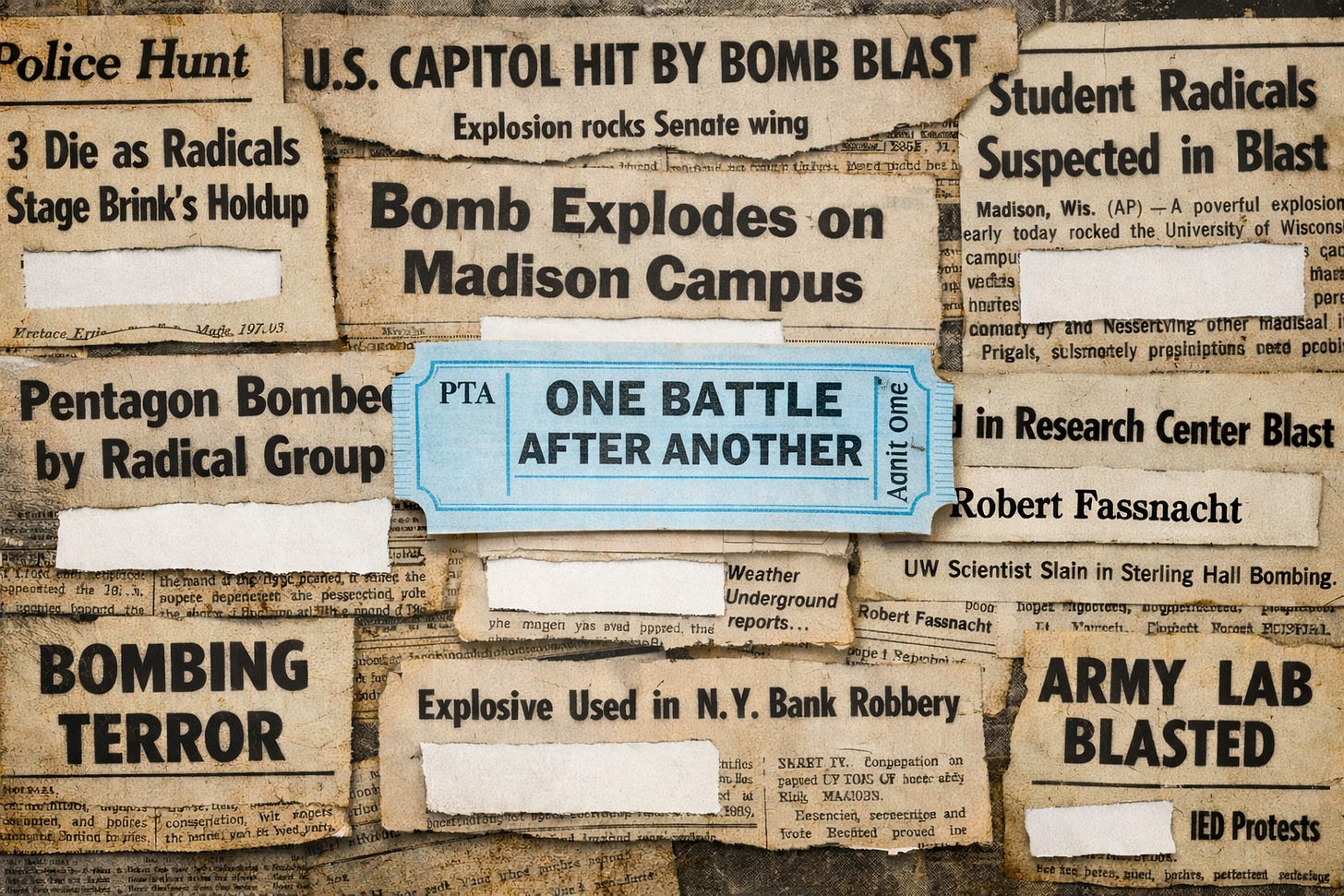 The 1970 Sterling Hall bombing killed Robert Fassnacht, a 33-year-old physics researcher, at 3:42 AM while he worked late preparing for a family vacation. His children were 3 and 1. This week, I watched Paul Thomas Anderson’s $175 million film about 1970s revolutionaries. It took me two hours and forty-two minutes to realize—Fassnacht isn’t there.